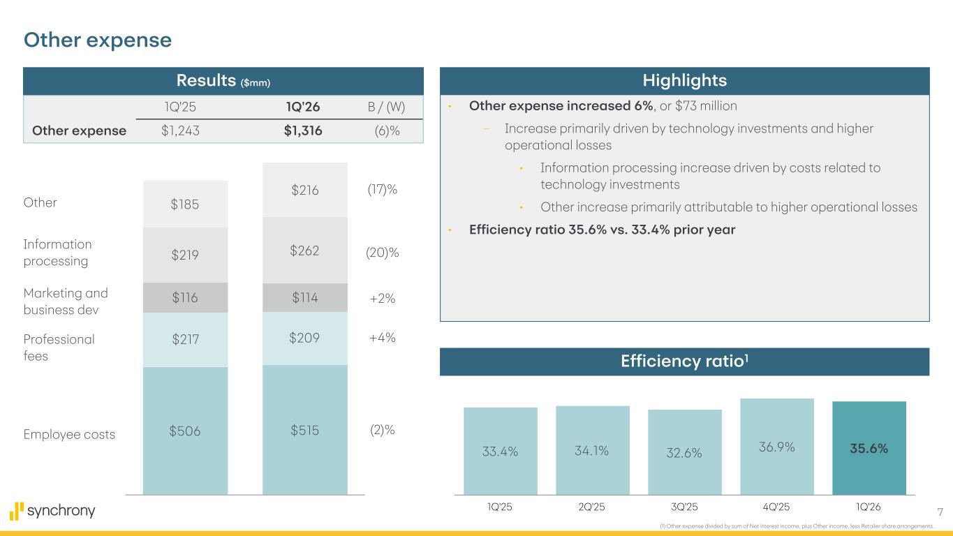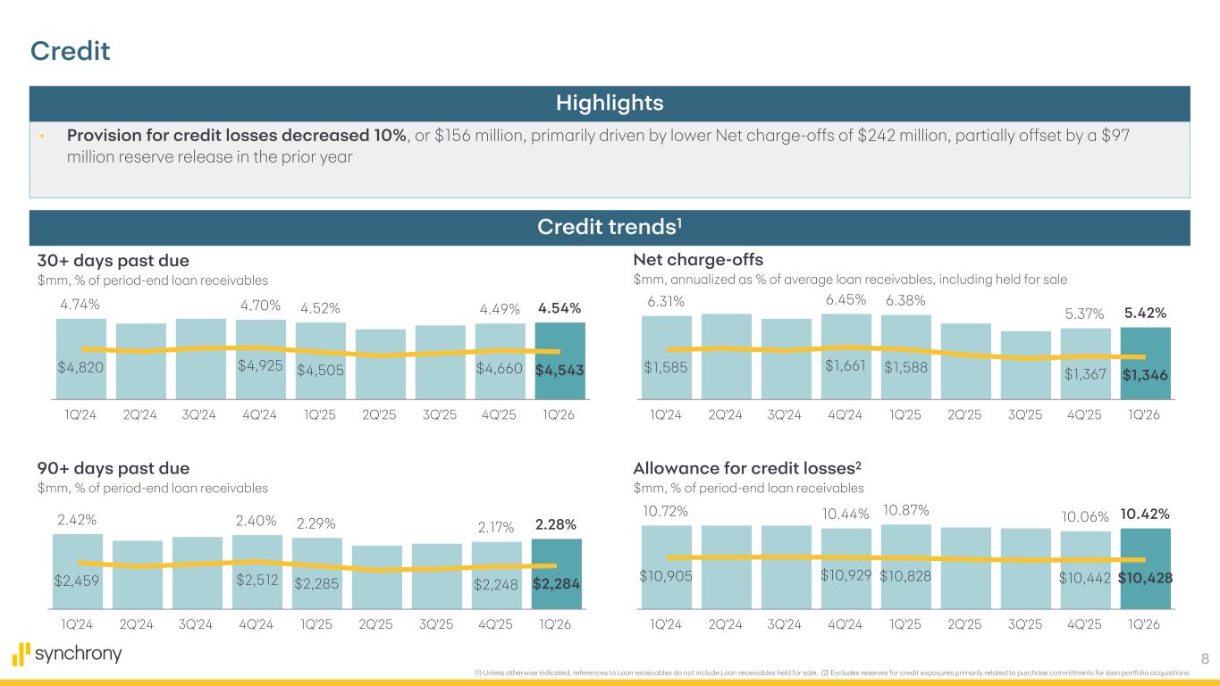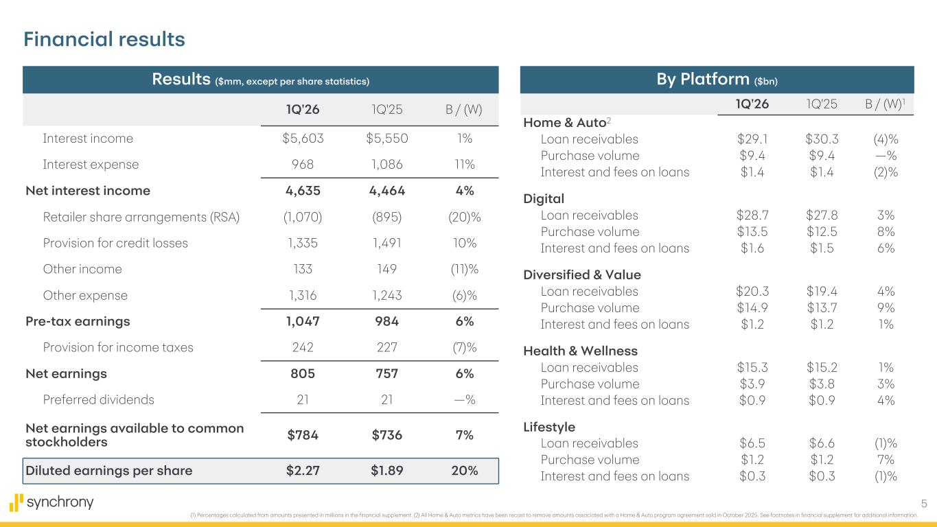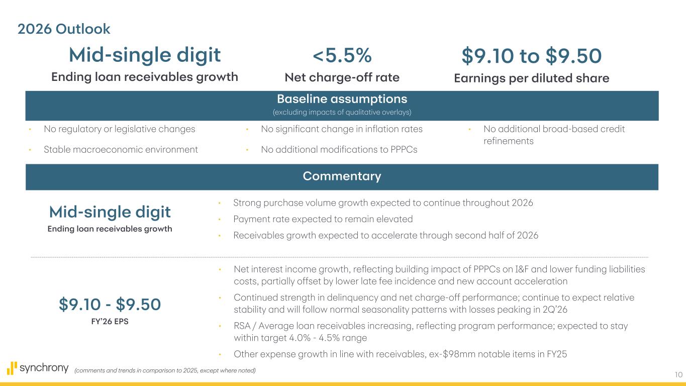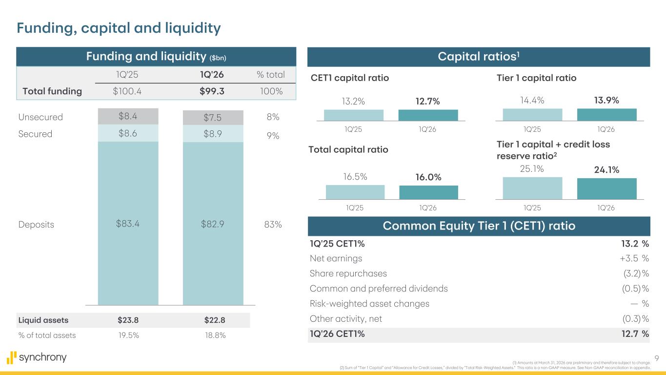 2 Disclaimers Cautionary Statement Regarding Forward-Looking Statements The following slides are part of a presentation by Synchrony Financial in connection with reporting quarterly financial results and should be read in conjunction with the earnings release and financial supplement included as exhibits to our Current Report on Form 8-K filed today and available on our website (www.investors.synchrony.com) and the SEC's website (www.sec.gov). All references to net earnings and net income are intended to have the same meaning. All comparisons are for the first quarter of 2026 compared to the first quarter of 2025, unless otherwise noted. This presentation contains certain forward-looking statements as defined in Section 27A of the Securities Act of 1933, as amended, and Section 21E of the Securities Exchange Act of 1934, as amended, which are subject to the "safe harbor" created by those sections. Forward-looking statements may be identified by words such as "expects," "intends," "anticipates," "plans," "believes," "seeks," "targets," "outlook," "estimates," "will," "should," "may," “aim,” “focus,” “goal,” “confident,” “trajectory,” "priorities," "designed," "consider," “opportunity” or words of similar meaning, but these words are not the exclusive means of identifying forward-looking statements. Forward-looking statements are based on management's current expectations and assumptions, and are subject to inherent uncertainties, risks and changes in circumstances that are difficult to predict. As a result, actual results could differ materially from those indicated in these forward-looking statements. Factors that could cause actual results to differ materially include global political, economic, business, competitive, market, regulatory and other factors and risks, such as: the impact of macroeconomic and geopolitical conditions, including factors impacting consumer confidence and economic growth in the United States, such as inflation, interest rates, tariffs (including retaliatory tariffs), energy prices, global conflicts and an economic downturn or recession, and whether industry trends we have identified develop as anticipated; the impact of changes made or influenced by the U.S. presidential administration and Congress on fiscal, monetary and regulatory policy, including with respect to constraints on the pricing of our credit products; the impact of the federal government shutdowns; retaining existing partners and attracting new partners, concentration of our revenue in a small number of partners, and promotion and support of our products by our partners; cyber-attacks or other security incidents or breaches; disruptions in the operations of our and our outsourced partners' computer systems and data centers; the financial performance of our partners; product, pricing, and policy changes related to the Consumer Financial Protection Bureau’s (the “CFPB”) final rule on credit card late fees, which was vacated in April 2025; the sufficiency of our allowance for credit losses and the accuracy of the assumptions or estimates used in preparing our financial statements, including those related to the CECL accounting guidance; higher borrowing costs and adverse financial market conditions impacting our funding and liquidity, and any reduction in our credit ratings; our ability to grow our deposits in the future; damage to our reputation; our ability to securitize our loan receivables, occurrence of an early amortization of our securitization facilities, and lower payment rates on our securitized loan receivables; changes in benchmark or market interest rates; effectiveness of our risk management processes and procedures, reliance on models which may be inaccurate or misinterpreted, and our ability to manage our credit risk; our ability to offset increases in our costs in retailer share arrangements; competition in the consumer finance industry; our concentration in the U.S. consumer credit market and susceptibility to market fluctuations and legislative and regulatory developments; our ability to successfully develop and commercialize new or enhanced products and services; our ability to realize the value of acquisitions, dispositions and strategic investments; reductions in interchange fees; fraudulent activity; failure of third-parties to provide various services that are important to our operations; international risks and compliance and regulatory risks and costs associated with international operations; alleged infringement of intellectual property rights of others and our ability to protect our intellectual property; litigation, regulatory actions and compliance issues; our ability to attract, retain and motivate key officers and employees; tax legislation initiatives or challenges to our tax positions and/or interpretations, and state sales tax rules and regulations; regulation, supervision, examination and enforcement of our business by governmental authorities, the impact of the Dodd-Frank Wall Street Reform and Consumer Protection Act and other legislative and regulatory developments and the impact of the CFPB’s regulation of our business, including new requirements and constraints the Company and the Bank are or will become subject to as a result of having $100 billion or more in total assets; impact of capital adequacy rules and liquidity requirements; restrictions that limit our ability to pay dividends and repurchase our common stock, and restrictions that limit the Bank’s ability to pay dividends to us; regulations relating to privacy, information security and data protection; use of third-party vendors and ongoing third-party business relationships; and failure to comply with anti-money laundering and anti-terrorism financing laws. For the reasons described above, we caution you against relying on any forward-looking statements, which should also be read in conjunction with the other cautionary statements that are included elsewhere in this