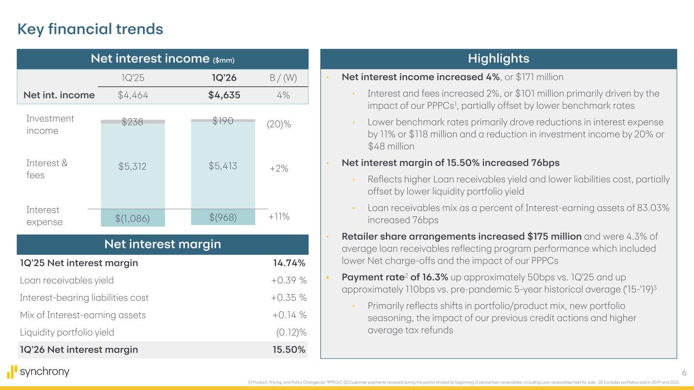 5 (1) Percentages calculated from amounts presented in millions in the financial supplement. (2) All Home & Auto metrics have been recast to remove amounts associated with a Home & Auto program agreement sold in October 2025. See footnotes in financial supplement for additional information. Financial results Results ($mm, except per share statistics) By Platform ($bn) 1Q'26 1Q'25 B / (W) Interest income $5,603 $5,550 1% Interest expense 968 1,086 11% Net interest income 4,635 4,464 4% Retailer share arrangements (RSA) (1,070) (895) (20)% Provision for credit losses 1,335 1,491 10% Other income 133 149 (11)% Other expense 1,316 1,243 (6)% Pre-tax earnings 1,047 984 6% Provision for income taxes 242 227 (7)% Net earnings 805 757 6% Preferred dividends 21 21 —% Net earnings available to common stockholders $784 $736 7% Diluted earnings per share $2.27 $1.89 20% 1Q'26 1Q'25 B / (W)1 Home & Auto2 Loan receivables $29.1 $30.3 (4)% Purchase volume $9.4 $9.4 —% Interest and fees on loans $1.4 $1.4 (2)% Digital Loan receivables $28.7 $27.8 3% Purchase volume $13.5 $12.5 8% Interest and fees on loans $1.6 $1.5 6% Diversified & Value Loan receivables $20.3 $19.4 4% Purchase volume $14.9 $13.7 9% Interest and fees on loans $1.2 $1.2 1% Health & Wellness Loan receivables $15.3 $15.2 1% Purchase volume $3.9 $3.8 3% Interest and fees on loans $0.9 $0.9 4% Lifestyle Loan receivables $6.5 $6.6 (1)% Purchase volume $1.2 $1.2 7% Interest and fees on loans $0.3 $0.3 (1)%