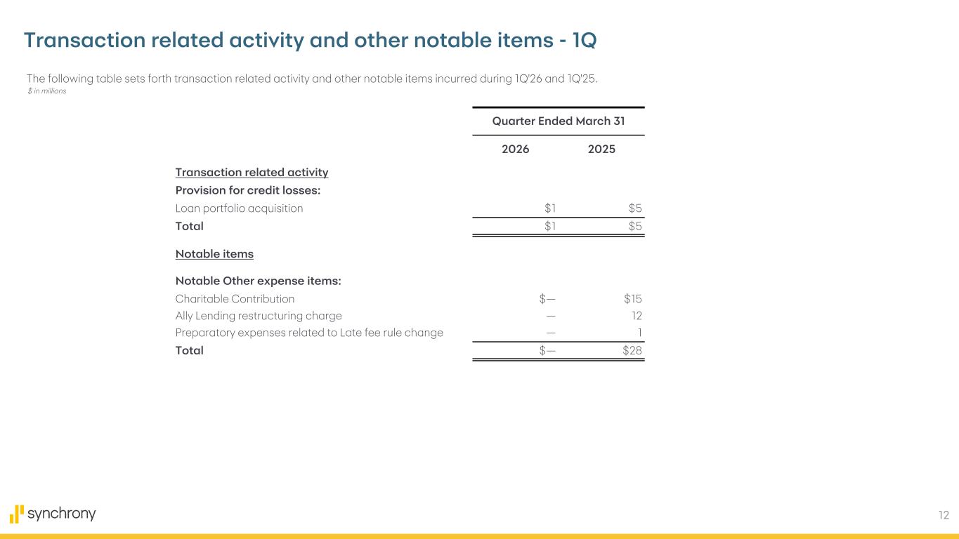 12 The following table sets forth transaction related activity and other notable items incurred during 1Q'26 and 1Q'25. Transaction related activity and other notable items - 1Q $ in millions Quarter Ended March 31 2026 2025 Transaction related activity Provision for credit losses: Loan portfolio acquisition $1 $5 Total $1 $5 Notable items Notable Other expense items: Charitable Contribution $— $15 Ally Lending restructuring charge — 12 Preparatory expenses related to Late fee rule change — 1 Total $— $28