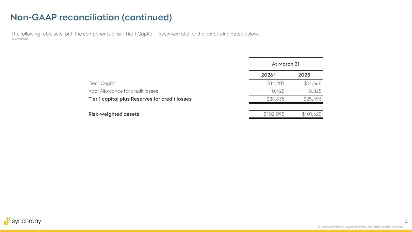 13 The following table sets forth a reconciliation between GAAP results and non-GAAP adjusted results. Non-GAAP reconciliation 1Q'26 4Q'25 3Q'25 2Q'25 1Q'25 Tangible common equity: GAAP Total equity $16,477 $16,766 $17,065 $16,952 $16,581 Less: Preferred stock (1,222) (1,222) (1,222) (1,222) (1,222) Less: Goodwill (1,363) (1,363) (1,274) (1,274) (1,274) Less: Intangible assets, net (1,223) (1,255) (909) (862) (847) Tangible common equity $12,669 $12,926 $13,660 $13,594 $13,238 Tangible book value per share: Book value per share $45.29 $44.74 $44.00 $42.30 $40.37 Less: Goodwill (4.04) (3.92) (3.55) (3.43) (3.35) Less: Intangible assets, net (3.63) (3.61) (2.52) (2.32) (2.23) Tangible book value per share $37.62 $37.21 $37.93 $36.55 $34.79 $ in millions, except per share data